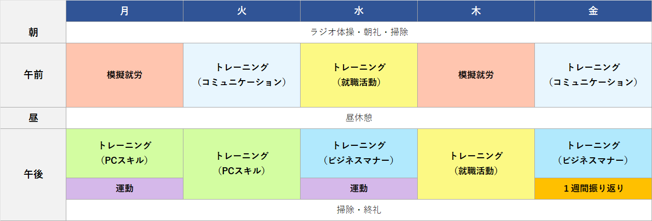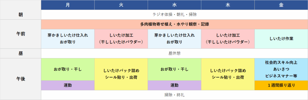 サービス 私たちは、2つの就労支援サービスを提供しています。「働くこと」への不安や課題を抱える方に、安心してステップアップできる環境をご用意しています。 就労継続支援B型 利用定員20名 利用期間の制限はなし 利用時間は10時~16時 作業工賃は1時間の作業で250円 1. 施設内就労・しいたけの加工 ・多肉植物やハーブの栽培 ・手工芸等 2. 施設外就労・グループ企業の農業法人で作業 ・広々とした菌床しいたけ農場 ・土に癒される畑で露地栽培農場 3.地域とのつながり・地域のイベントやお祭りなどへの参加・農作物や手工芸品の販売 ・地域との交流動 就労継続支援B型週間プログラム(例) 日付月火水水金 朝ラジオ体操・朝礼・掃除午前多肉植物寄せ植え・水やり観察・記録芽かきしいたけ仕入 おがとりしいたけ加工 (干ししいたけパウダー)昼午後Table DataTable DataTable DataTable DataTable Data ↓タップして拡大 ●しいたけ・多肉植物を理解してもらう為に、まずは動画視聴や職員からの説明の時間を作ります。●施設外就労希望者は、基礎プログラム修了してから農業法人株式会社明嶺薗にて作業に取り組んでいただきます●しいたけ加工・多肉植物の栽培、その他軽作業があります●1日のタイムスケジュールは別紙参照してください *ダウンロードはこちら 就労移行支援 利用定員6名 利用期間は最長2年間 利用時間は10時~16時 実習期間中は実習先の就業時間に合わせる 1. 施設内研修・様々な研修プログラム 自己理解 対人コミュニケーション技術 ビジネスマナー等 ・礼節,対人コミュニケーション技術 ・基本的な PC操作(エクセル・ワード) ・履歴書作成や面接演習等 2.模擬就労訓練・作業内容により工賃が発生 ・1時間の作業で250円 ・施設外における模擬就労訓練もあり 3.施設外支援(実習)・実際の現場を想定し「働く」を意識した実習 グループ企業の農業法人 警備業や工事業 就労移行支援週間プログラム(例:利用開始6か月後) ↓タップして拡大 ●自分自身の障害特性を理解すること、社会適応力や対人コミュニケーションの訓練、具体的に希望する就労先に向けての書類作成サポートや面接訓練など、様々なプログラムがあります。●「働く」を意識した現場実習等で就労に自信がつきます。 ご利用について サービス提供日 原則月~金曜 年末年始と祝日をのぞく 休憩 昼食休憩1時間(その他、こまめな休憩あり) 昼食提供 昼食を希望する利用者は1食100円 持ち帰り不可 送迎 JR横浜線・相模原駅の送迎あり 利用回数 週3~5回(相談の上決定) 安心して活動していただけるよう安全管理や健康管理にも十分配慮し、職員一同、丁寧で温かみのある支援を心がけております。 私たちの理念 私たちの多機能型就労支援事業所では、安心して活動できる環境づくりを大切にしています。そのために、利用される皆さまと共に大切にしていきたい3つの心があります。それが 「礼節」「敬心」「共成」 です。 礼節 日々の活動の中で、挨拶や言葉づかいなど基本的な礼儀を大切にします。節度を持った行動は、お互いが気持ちよく安心して過ごせる環境につながります。 敬心 相手を思いやり、尊重する心を大切にします。同時に自分自身の存在も大切にすることで、信頼関係を築き、より豊かなつながりを育みます。 共成 仲間と力を合わせて取り組むことで、一人では得られない成果や喜びを分かち合います。ともに成長し、成果を築き上げることを目指します。